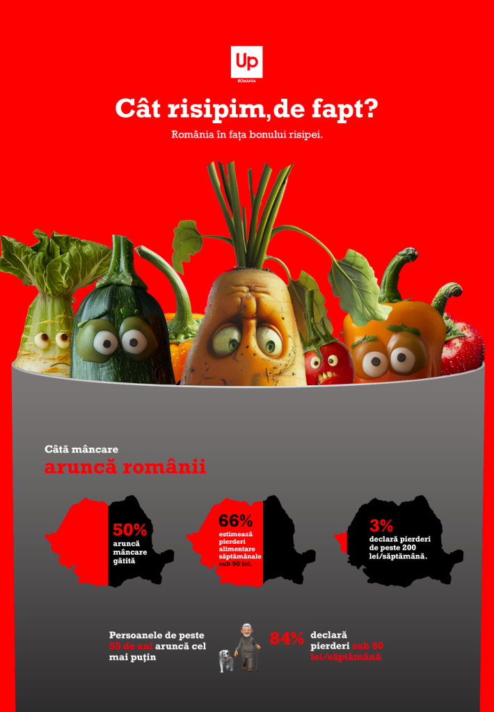 Aproape jumătate dintre români aruncă mâncare gătită, potrivit unui nou studiu realizat de Up România, în parteneriat cu Reveal Marketing Research.