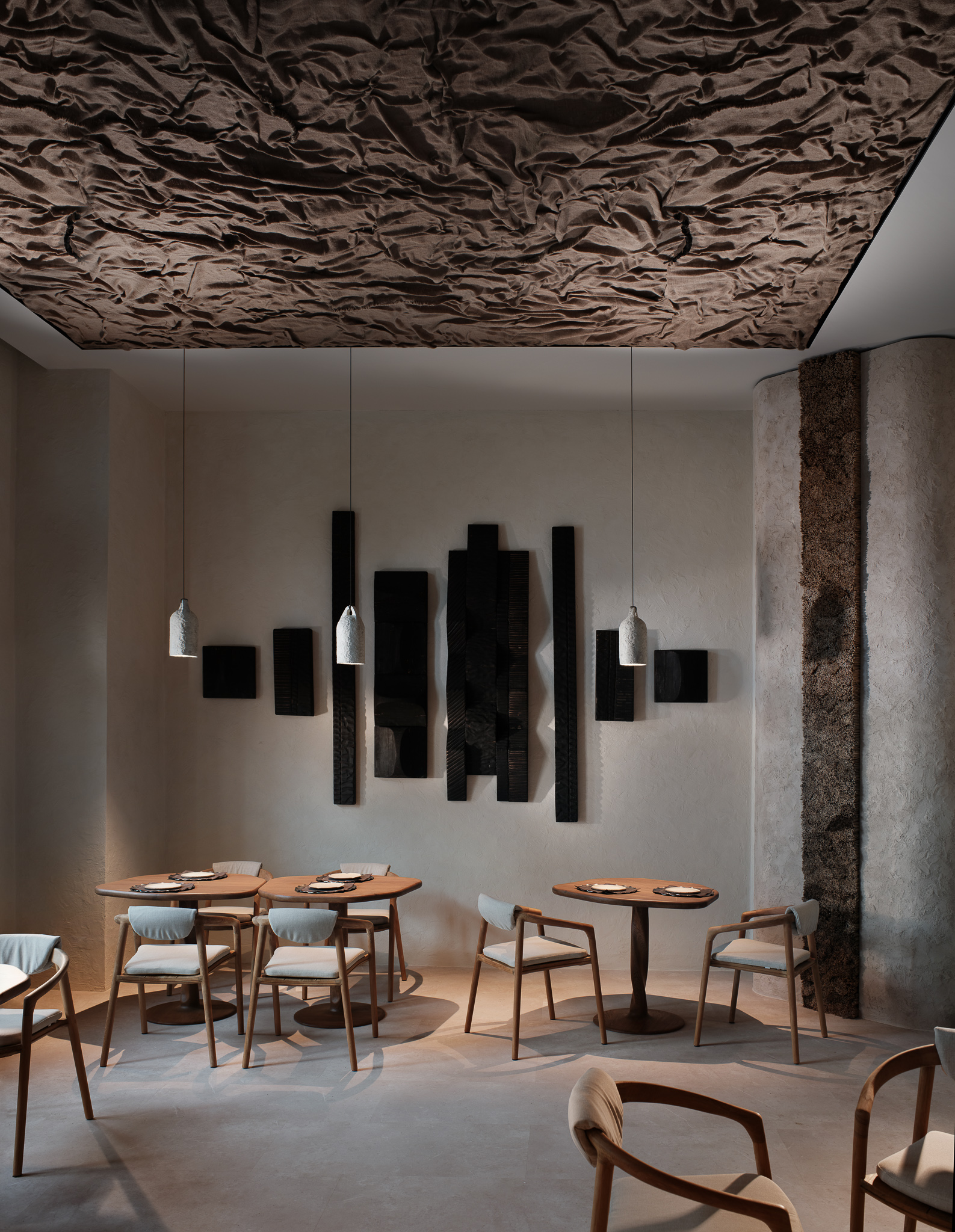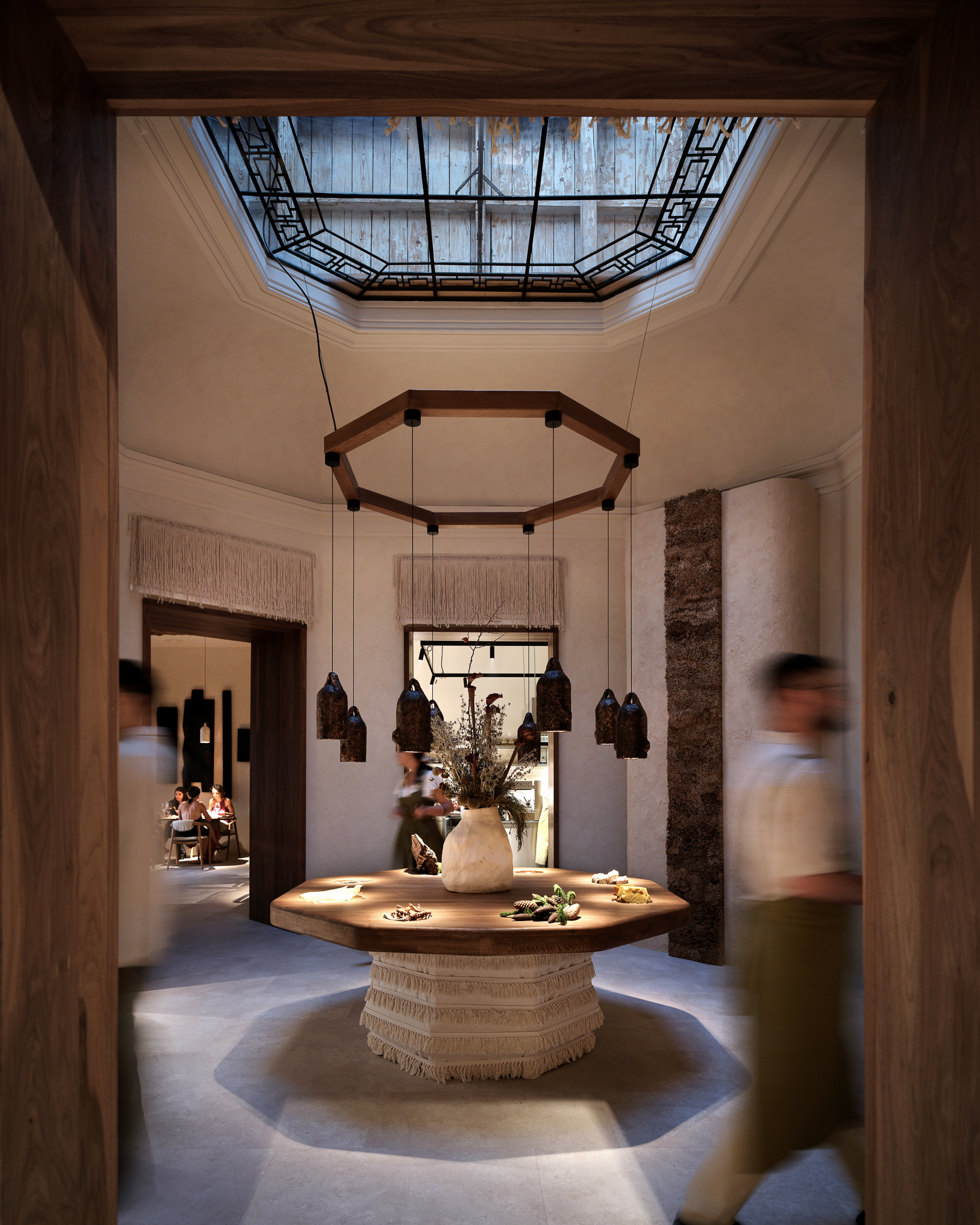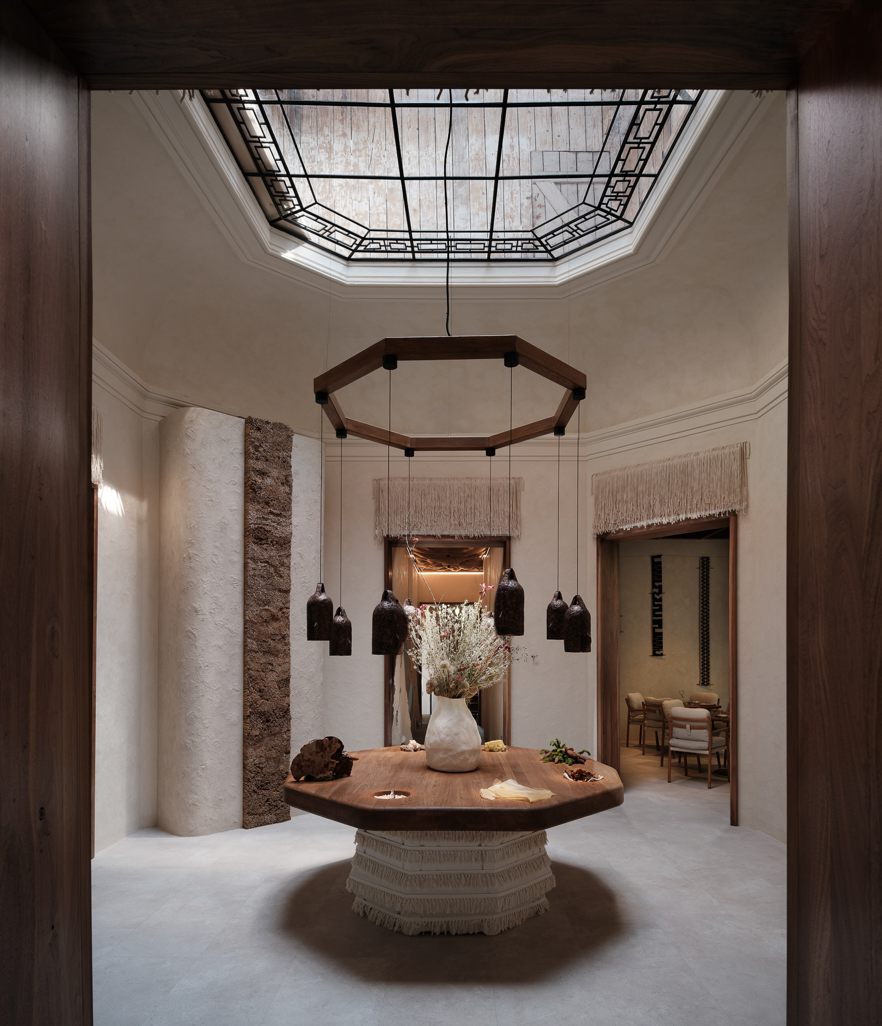 Plafonul din răchită împletită de artizani din Piatra Neamț, iuta creponată și textilele brodate manual de Iulia Lavu, obiectele ceramice semnate de Poemi și detaliile metalice lucrate de artizani romi sunt mai mult decât decor: sunt parte dintr-un demers conștient de a reda meșteșugului locul pe care îl merită în cultura vizuală contemporană.